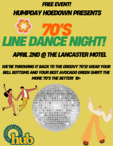70’s Line Dance Night! April 2, 20256:00 pmAdd this event to your calendarGoogle CalendarApple CalendarExport .ics fileOutlook LiveOutlook 360