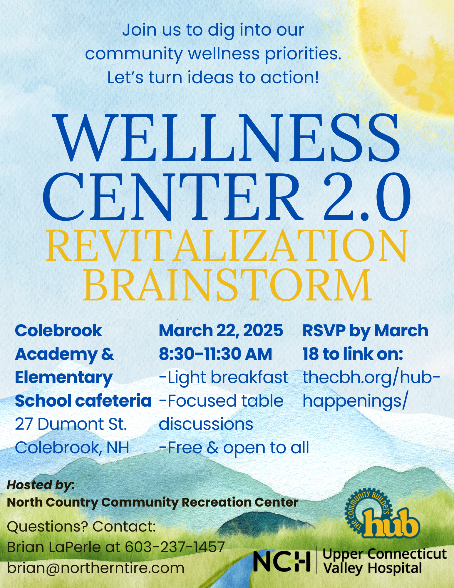 On Saturday, March 22, 2025 a Wellness Center 2.0 – Revitalization Brainstorm will be held from 8:30 – 11:30 a.m. at the Colebrook Academy & Elementary School cafeteria at 27 Dumont Street in Colebrook, NH. A complimentary light breakfast buffet of donuts, muffins, coffee, bottled water & fruit will be available for attendees, courtesy of The Community Builders Hub.