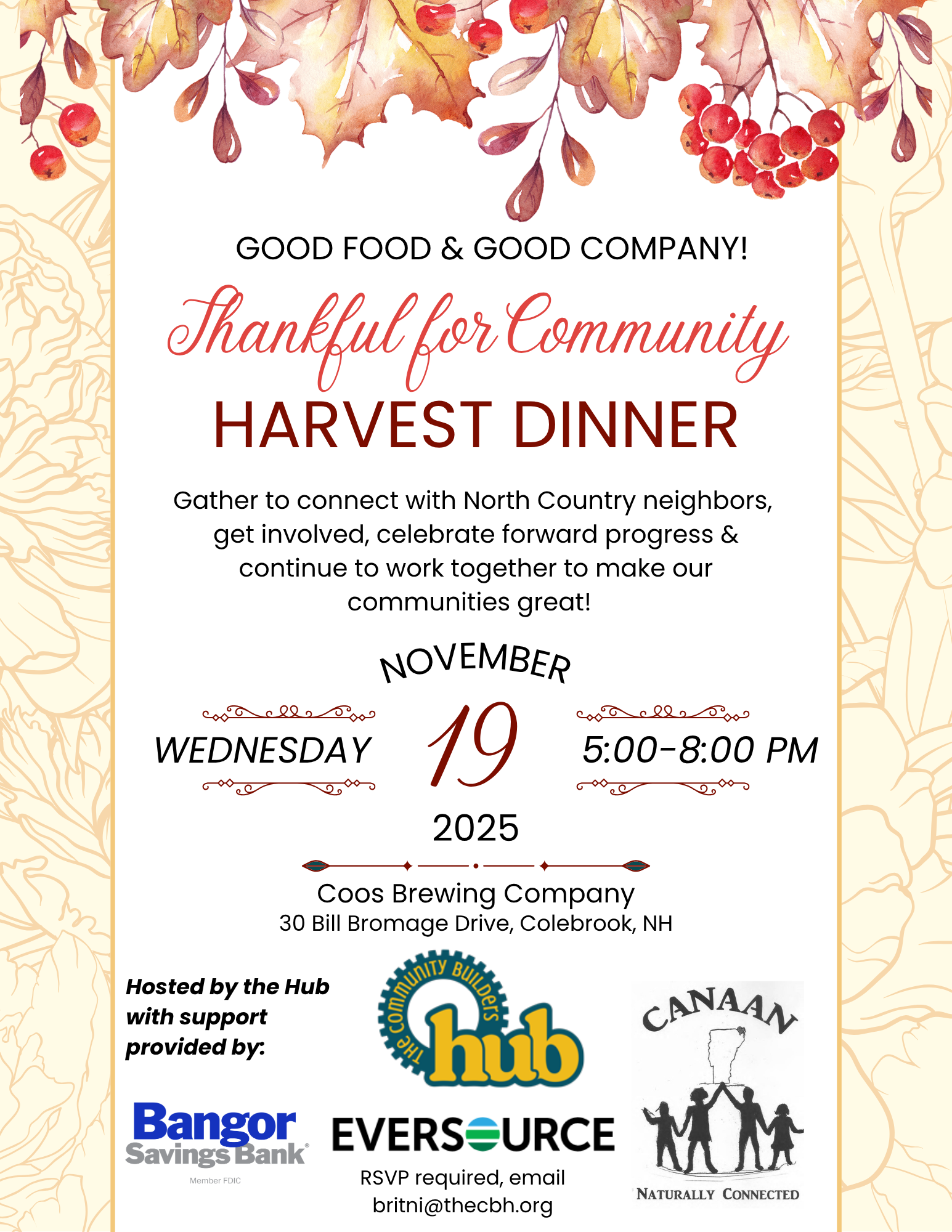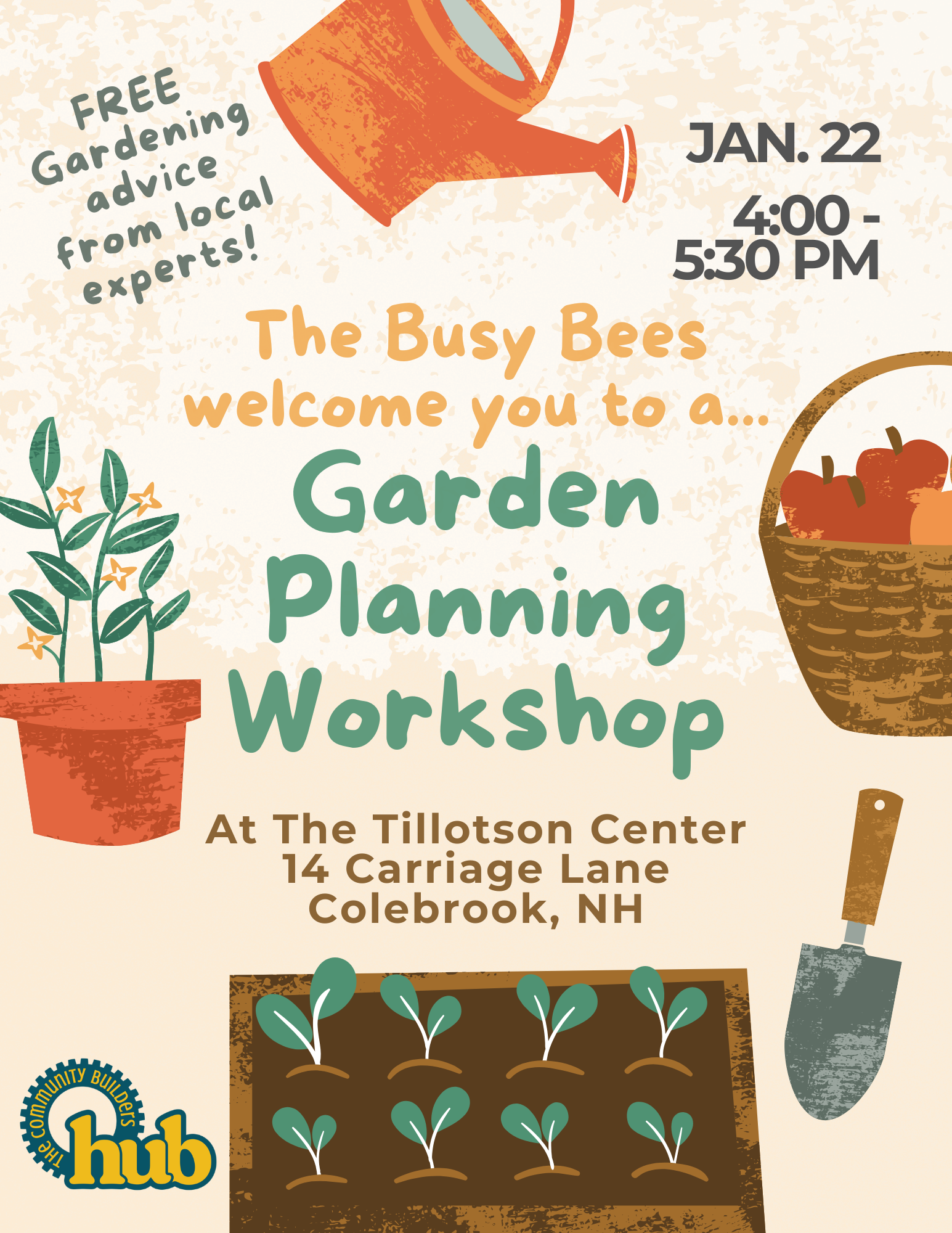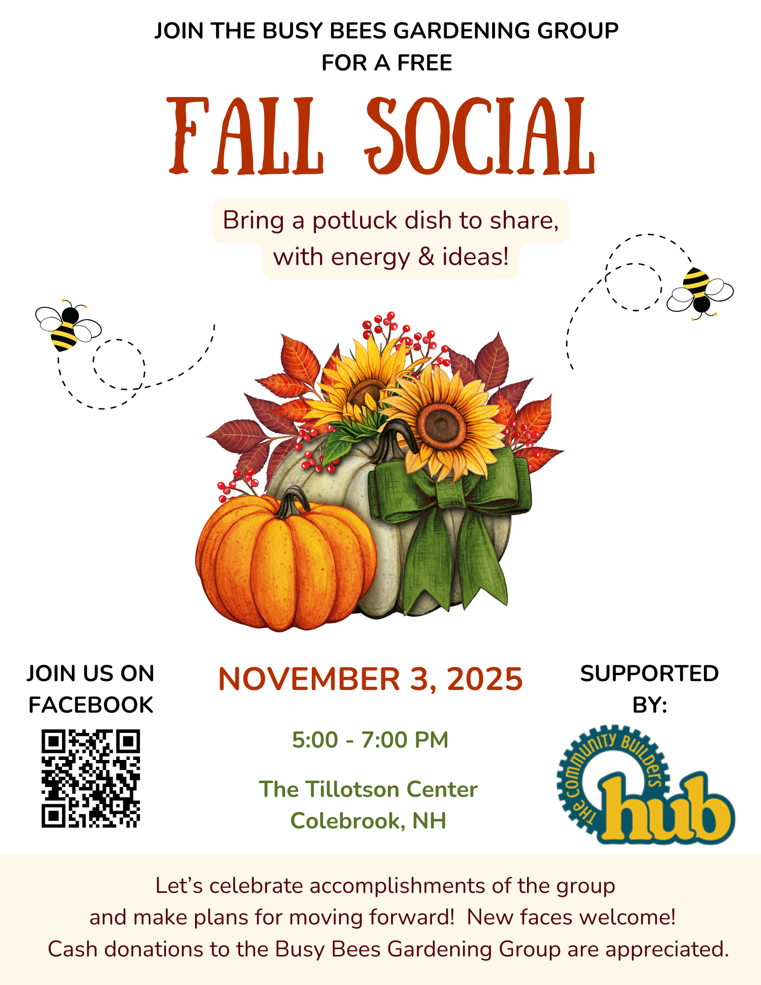 The Busy Bees Gardening Group invites gardeners and social butterflies to a free Fall Social at the Tillotson Center, located at 14 Carriage Lane in Colebrook, NH on November 3rd, from 5:00 - 7:00 PM. All are welcome to join in a potluck dinner, by bringing a favorite dish to share (appetizers, crockpots, casseroles, breads,… Continue Reading Busy Bees Fall Social