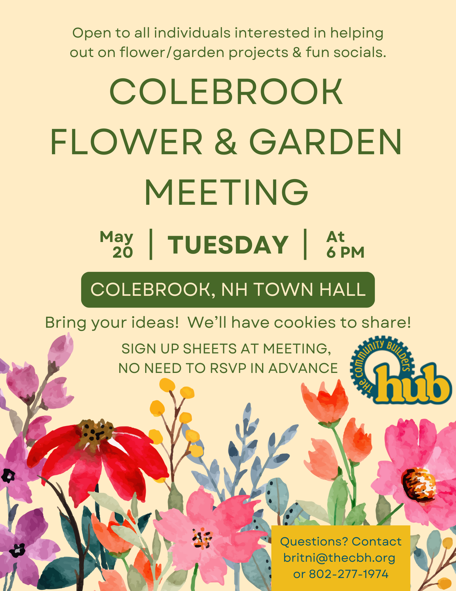 Interested in working on flower & garden projects in Colebrook? Want to be part of a fun, new, casual social club that is forming? Join us at this meeting, to see what we can come up with together! There will be opportunities to sign up for what you are interested in doing and a chance… Continue Reading Colebrook Flower & Garden Meeting