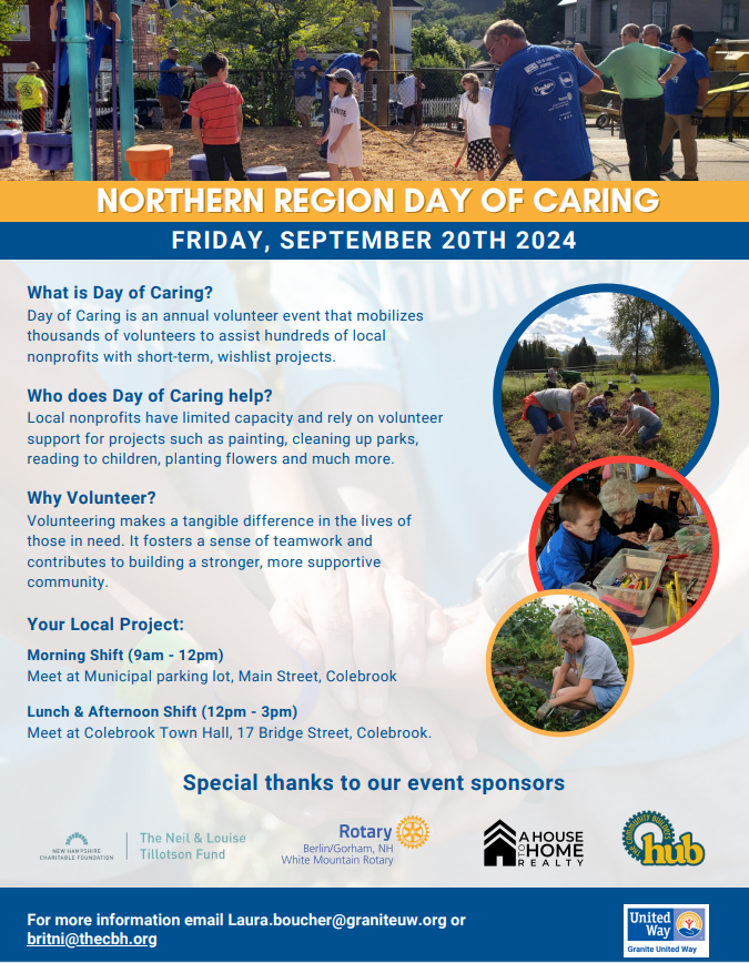 On September 20th, Granite United Way’s Northern Region Day of Caring will take place in Colebrook, coordinated in partnership with The Community Builders Hub, with additional support from The Neil & Louise Tillotson Fund, White Mountain Rotary and A House to Home Realty. Day of Caring is an annual volunteer event that mobilizes thousands of… Continue Reading Day of Caring in Colebrook